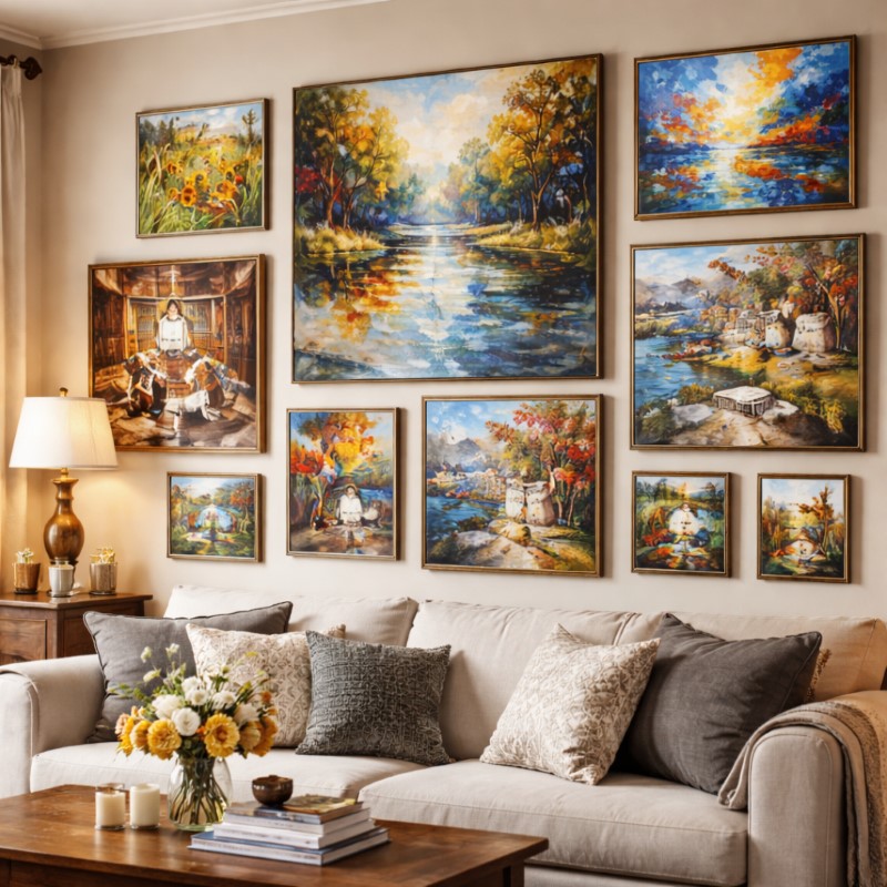 Galerijski zid sa više umetničkih slika u enterijeru